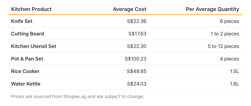 You can’t cook without a pot or pan. Even more, if you want to boil, fry, and steam, you’re going to need a diverse set of cookware to do so. Thankfully, many stores sell them in sets, so that you can buy a matching collection of cookware like large pots for pasta or woks for stir fry. A 4-piece set goes for an average S$100.23 on Shopee, which sells brands like Ecowin, Tefal, and ANAEAT. If you don’t have as much space or budget for 4 pots, you can look at a 3-pan set that is priced at an average of S$62.63, effectively saving you up to 60% on cookware.