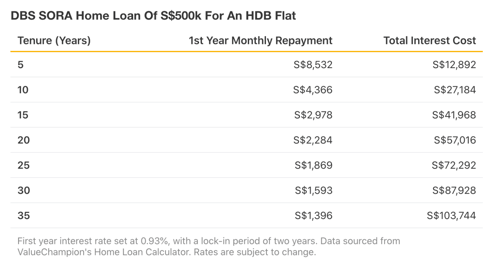 If you took out a S$500k loan over a 15-year tenure, your monthly instalments would be S$2,978. With a 30-year loan tenure, you’d pay 37% less in monthly instalments at S$1,868 per month. Thus, you should speak with a home loan counsellor about term extension if you seek to significantly reduce your monthly payments. Just make sure you keep in mind that you will be paying much more in interest over the course of your tenure — in this case, 110% more.