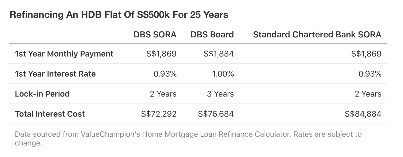 Banks change their interest rates often and also have varying lock-in periods and other home loan terms. Thus, even if two lenders have the same first-year interest rate, it doesn’t mean you’ll pay the same total interest cost by the end of the mortgage term. For instance, DBS SORA and SCB SORA have the same 1st year monthly payment, interest rates and lock-in period. But, after a 25-year term, you pay 17.4% more in total interest with SCB SORA. With this in mind, it’s important to do your due diligence when comparing new lenders to refinance your mortgage. You can use a mortgage refinancing calculator to get a better sense of different options.