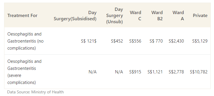 Treating food poisoning in Singapore is a cheaper medical expense than most other diseases that require treatment. In most cases, food poisoning can be resolved at home with hydration and over the counter drugs. However, in some cases you’ll need to get treated at a polyclinic or at a hospital. If you choose to visit a clinic, you can expect to pay S$20-S$120 for a consultation{.ShortcodeLink–root}. On the other hand, the average hospital visit to treat gastroenteritis (either from gastric flu or food poisoning) costs as low as S$121-S$452 for simple non-complicated day surgery, but can increase to an average bill of S$10,782 if you have severe complications and choose to get treated at a private hospital.