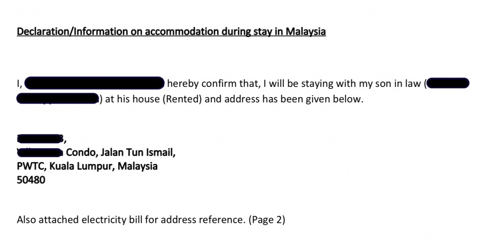 - For any applicant who is planning to stay with relatives in Malaysia, you are advice to write a cover letter in English and specify the accommodation details and upload it into your application.