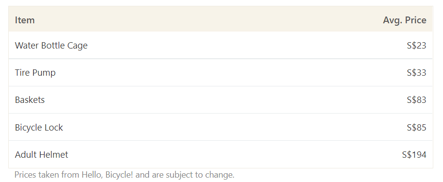 When it comes to your clothing, there isn’t a recommended attire type of attire. However, the LTA recommends wearing bright clothing so motorists and pedestrians are able to see you clearly. Other useful gear includes a bike pump or tire repair kit for emergencies and bike water bottle cage and a basket for comfort on longer rides and errands. You will also need to get maintenance tools like brake cleaners and chain lubricants to ensure your bicycle is safe to ride at all times.