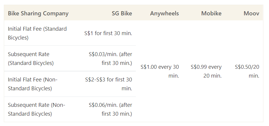 Just like with car sharing, there are plenty of bike-sharing companies you can use before you decide whether you want to invest in your own bicycle. The largest bike sharing company is currently SG Bike, along with Anywheel, GBikes, Mobike and Moov. These companies typically charge a set fee of S$1-S$3 for the first 20 minutes to half hour and then a subsequent fee for the rest of the time you use the bike. If you will be using a bicycle frequently, then you can also do a subscription plan where you pay a monthly fee and unlock multiple uses of the bicycle. Overall, a 30-minute commute may cost you an average of S$55 per month if you choose to use a bike-share service.
