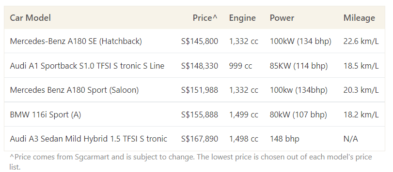 If you are more of a BMW fan, then BMW’s 116i Sport (A) will be the cheapest entry into the BMW range. Its current cost of S$155,888 is 28% cheaper than the popular BMW 3 series 318i Sport Sedan and up to 68% cheaper than a BMW 7 series model. If you are looking into an Audi (another very popular luxury car option), then your entry level option will be the Audi A1 or A3. The A1 Sportback costs roughly S$145,800 and the A3 mild hybrid sportback costs roughly S$166,000. Alternatively, you can upgrade to the A3 mild hybrid sedan for about S$1,700 more. That said, the A3 mild hybrid sedan will still cost you 20% less than Audi A4 mild hybrid sedan and 73% less than the new Audi RS e-tron GT Electric.