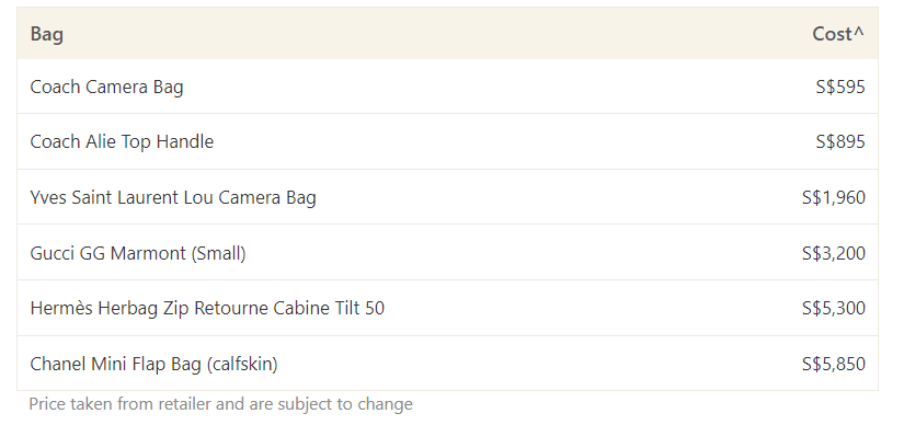 Just like watches, certain designer bags are also coveted investment pieces. For instance, the Hermès Birkin bag is the penultimate sign of wealth, thanks to its exclusivity and high price point. Chanel’s Classic Bag is another luxury handbag that has stood the test of time. But with prices above S$10,000, these bags cost more than an entry-level Rolex and more than double the median salary of the average Singaporean.