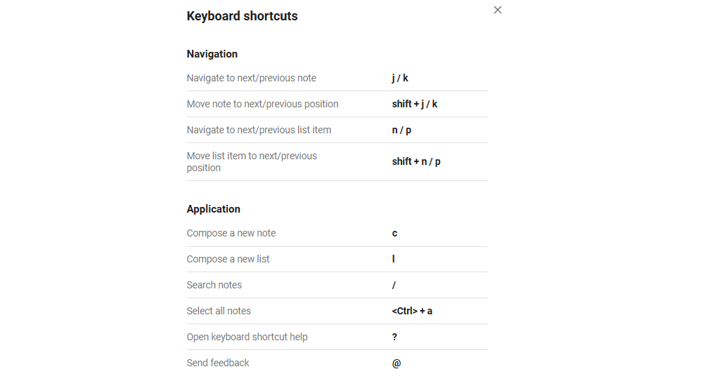 If you accessing Google Keep via a web browser, you have all these Keyboard shortcuts to manage your notes.